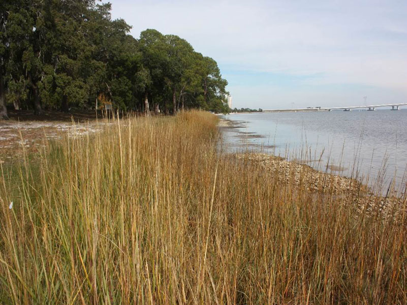 The Naval Support Activity Living Shoreline Project in Panama City, Florida covers three segments of shoreline, totaling 3,100 linear feet. Designed by Naval Support Activity in partnership with community volunteers, it includes an oyster reef breakwater made of loose, unconsolidated oyster shell and plantings of saltmarsh vegetation